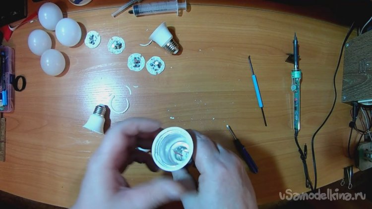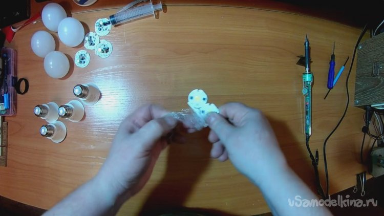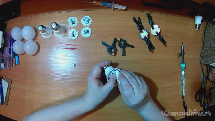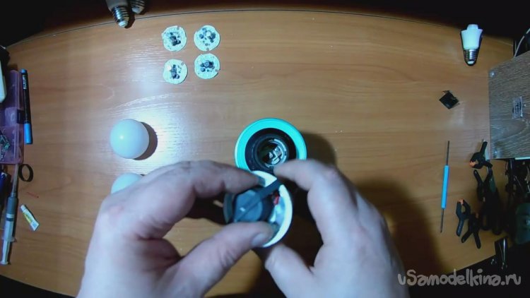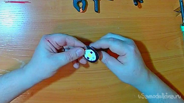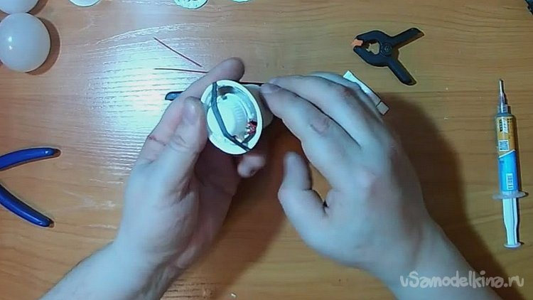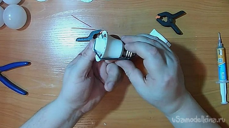 Далее прячем провода внутри корпуса лампочки и прижимаем светодиодный модуль к корпусу.
