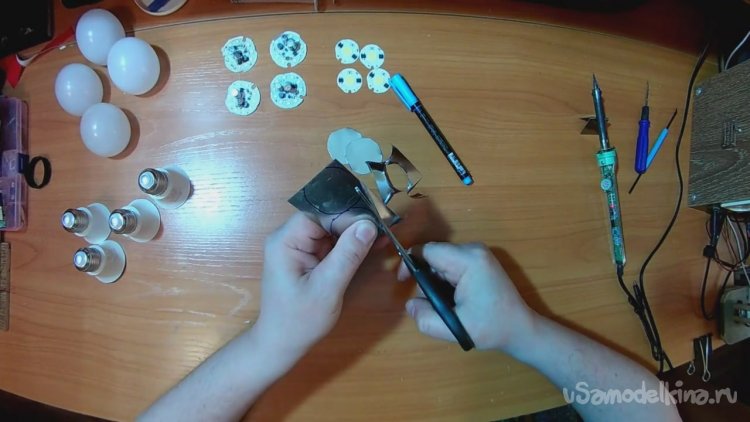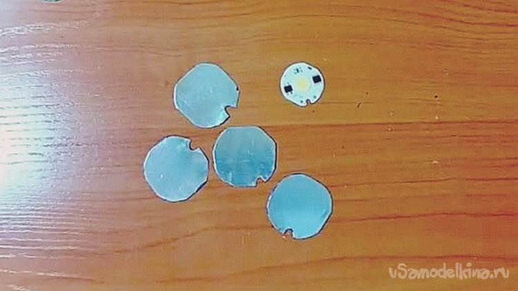 Так как новые светодиодные модули по размеру меньше чем старые сгоревшие, то будем вырезать из жести от баллонов освежителя воздуха кружки подкладки.