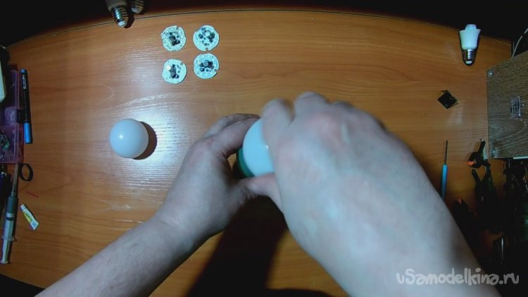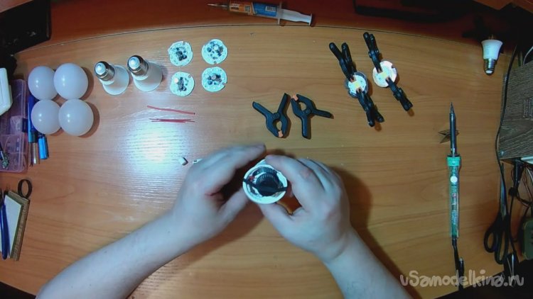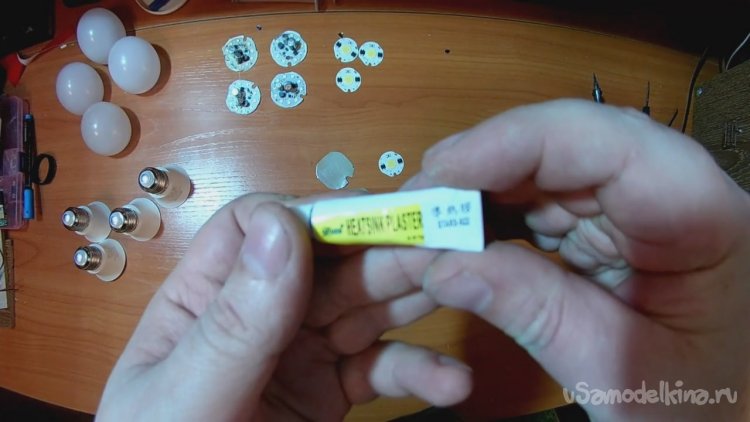 Затем берём теплопроводящий клей и наносим его по радиусу модуля, в месте соприкосновения модуля с корпусом лампочки.