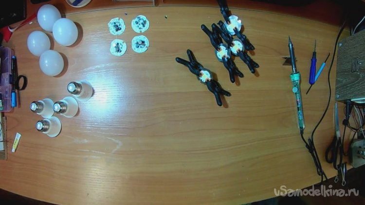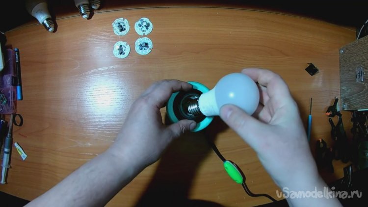 Через несколько (2-3) часов решил собрать и проверить все лампы. Даже ради проверки на камеру собрал из пластикового стакана, что-то типа стэнда с патроном.
