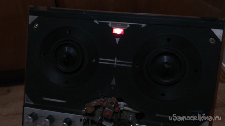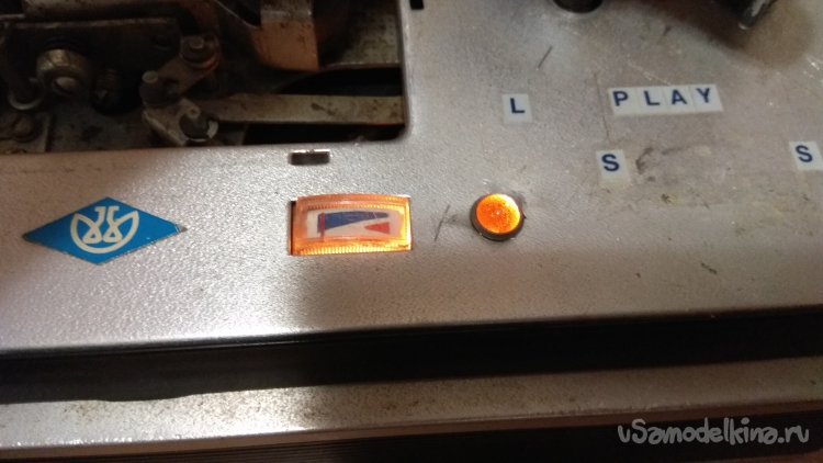 Родной индикатор включения был организован путем подсвечивания головки индикатора записи, вот только индикатор записи не работает во время воспроизведения. Поэтому я поставил кнопку, включающую подсветку только во время записи, так же над лампочкой установил индикаторный глазок, как говорится, что было в наличии модного и красивого, то и применяли: