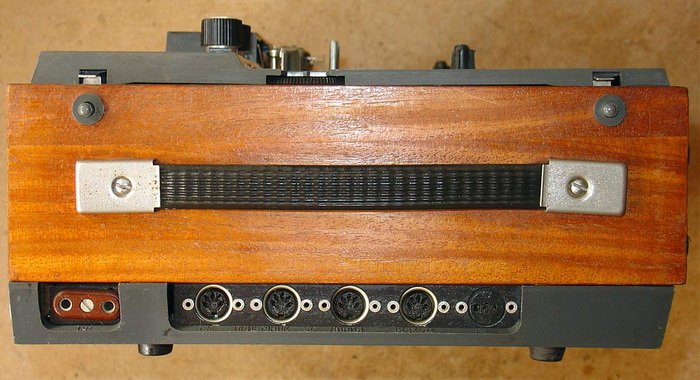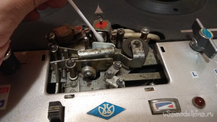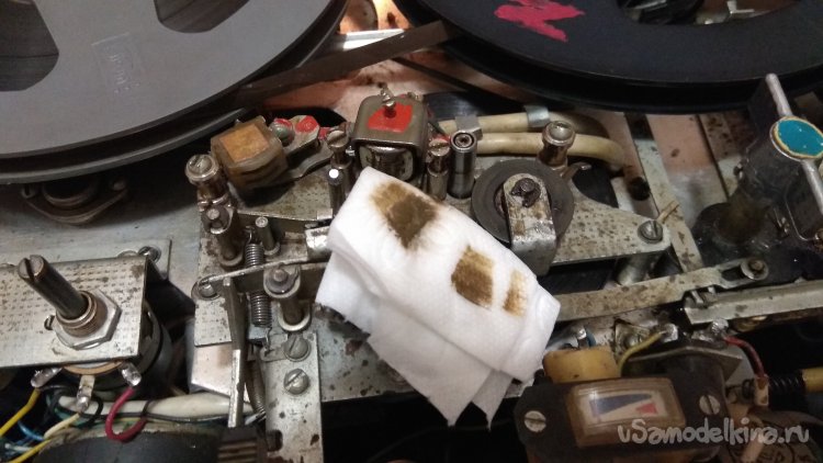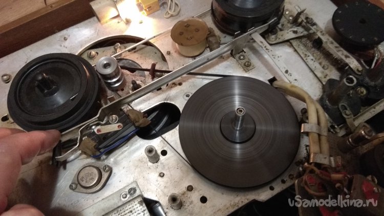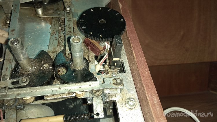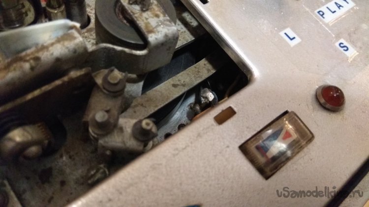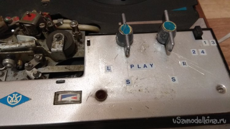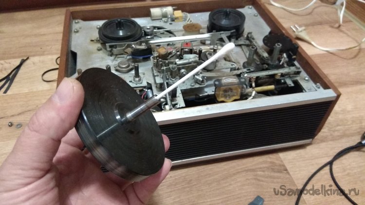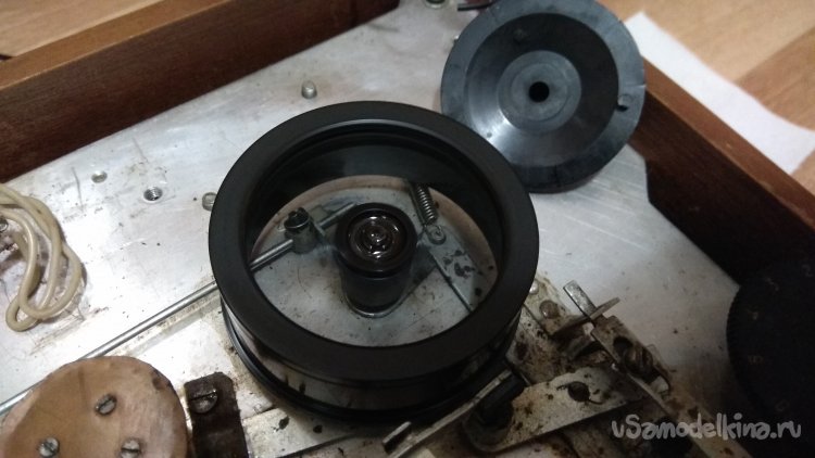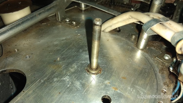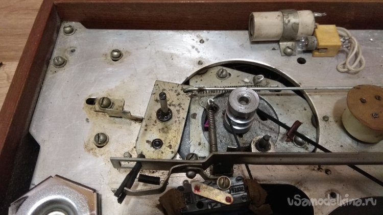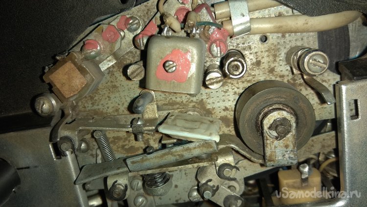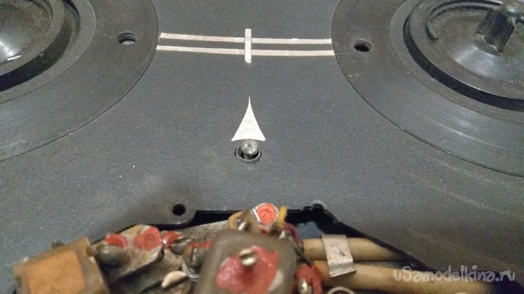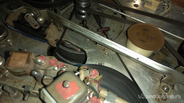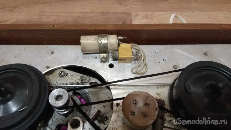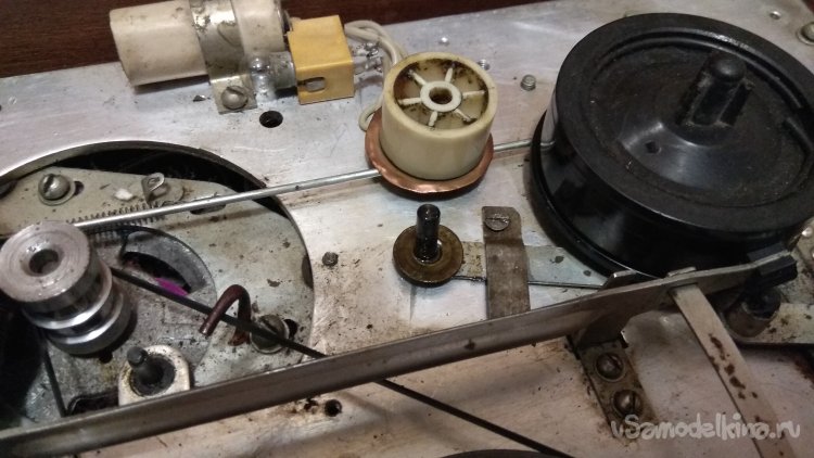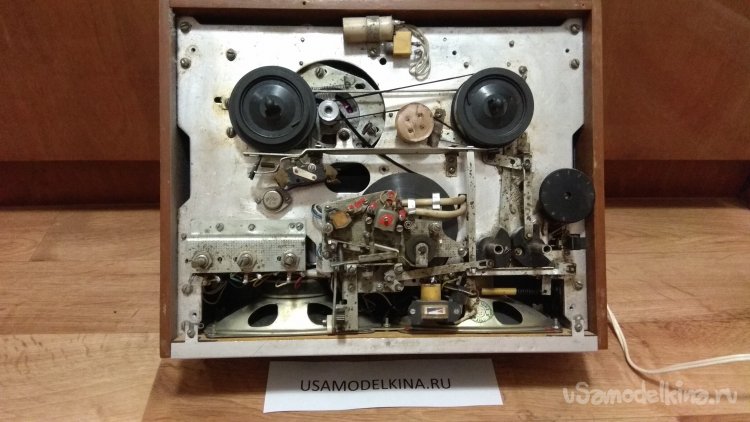 Скорее всего, крышка, закрывающая магнитные головки могла бы мешать бобинам, но у меня она отсутствует. Большие катушки немного терли по выступающим элементам верхней декоративной панели, пришлось немного, буквально на миллиметр шайбами поднять подкатушечники и блок с магнитными головками.