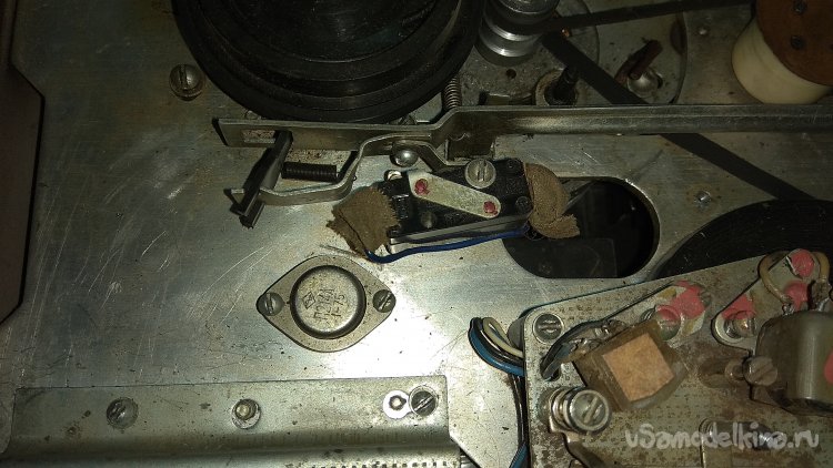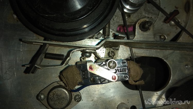 Под регулятором уровня записи виднеется микропереключатель типа МП-1, который включает лампочку возле индикатора записи. Он немного доработан, установлена нажимная пластина: