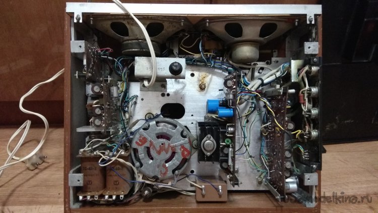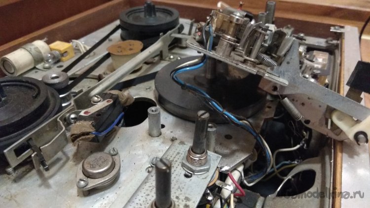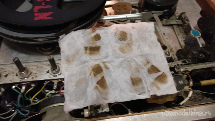 Как и ожидалось, с электроникой тоже проблемы: очень тихий искаженный звук, одна дорожка воспроизводится, вторая только при надавливании в бок кнопки переключения дорожек, переключатель нуждается в чистке, при включении режима записи сильный треск, тоже требуется чистка переключателя, шум при кручении регуляторов громкости и тембра. Об этом расскажу во второй части. Будем чинить электронику: