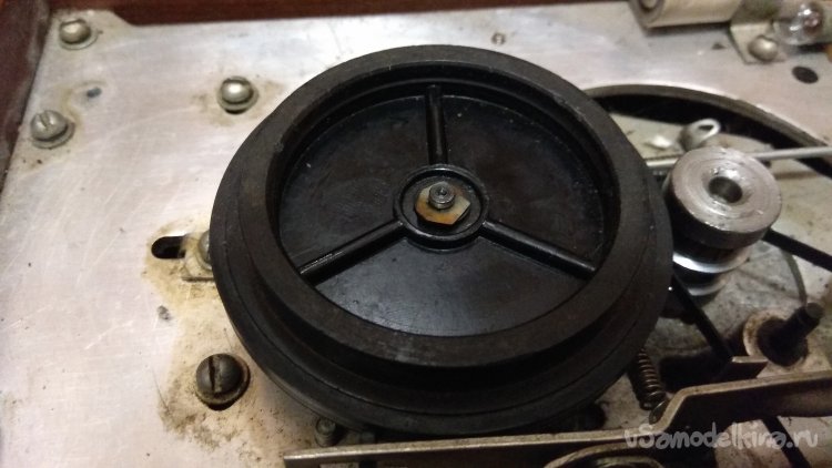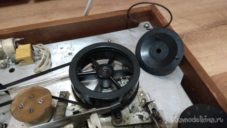 Когда износился лавсановый пассик маховика тонвала, найти такой же было просто невозможно. Это был первый и последний раз, когда я встречал лавсановые пассики. Пришлось лавсановый пассик заменить на резиновый и удалить штатный ролик натяжения по причине его ненадобности. Попутно были добавлены ограничители, чтобы пассик не выскакивал со шкива двигателя.