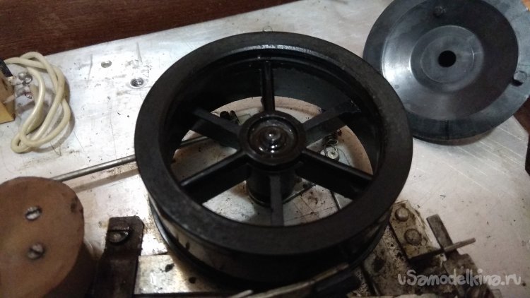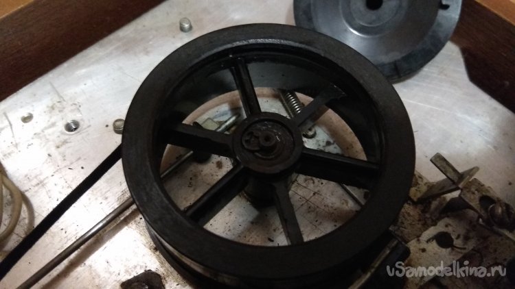 Поставил маховик на место. Пассик нужного размера не нашел. Временно поставил немного коротковатый пассик, который остался после ремонта кассетного магнитофона. На фото видны ограничители, чтобы пассик не сползал со шкива двигателя.