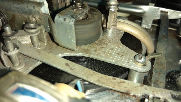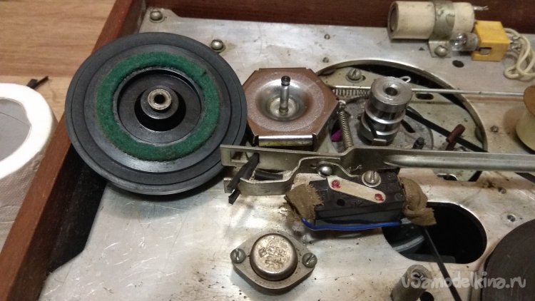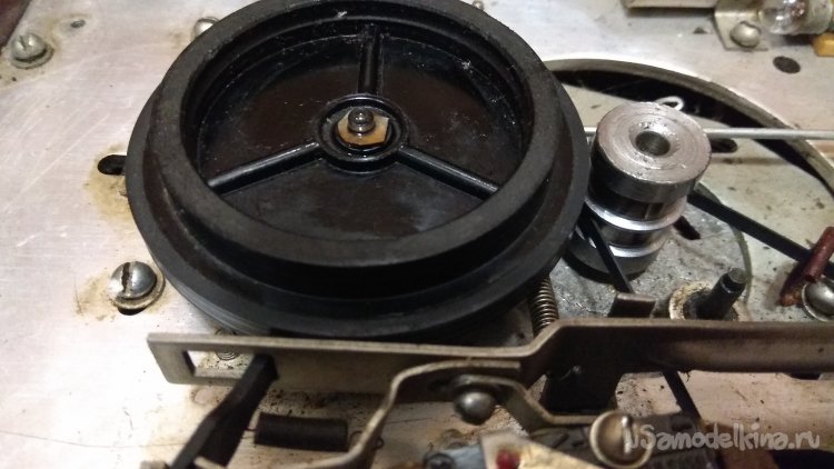 Сверху на ролике прикручен медный кружок предотвращающий соскальзывание пассика. Почему-то переодически пассик сползал, особенно во время перемотки.