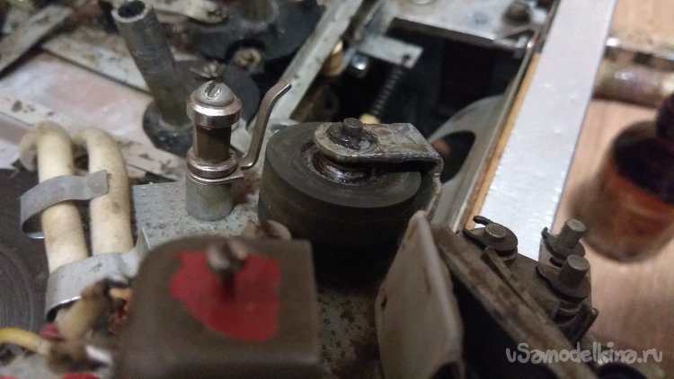 На очереди прижимной ролик тонвала. Его разбирать не стал, он достаточно легко крутится, просто капнул внутрь оси вазелинового масла.