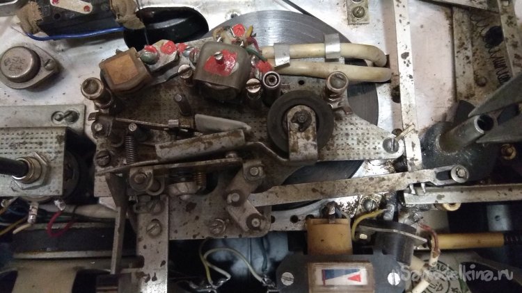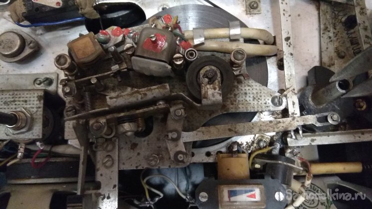 Очень интересно устройство подвода пленки к магнитным головкам. Одной тягой и рычажной системой заправляется пленка, прижимается ролик и прижим пленки к головке:
