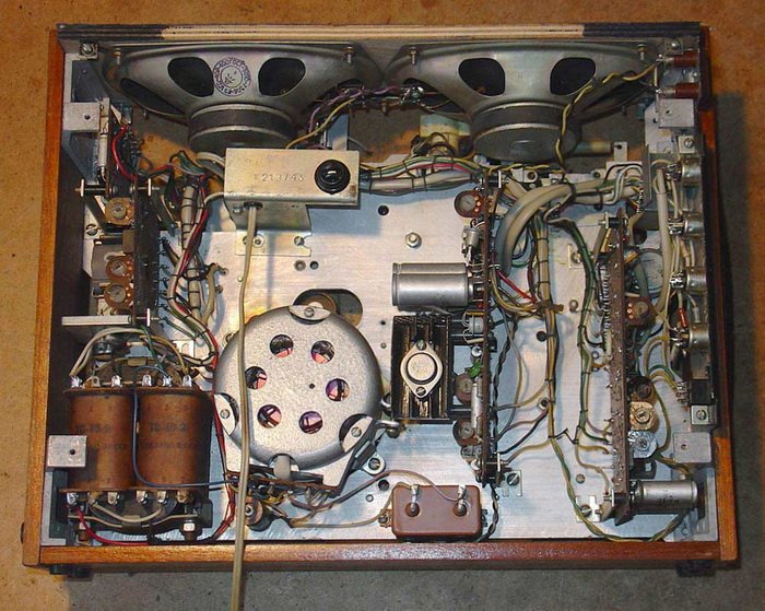 Сверху когда-то стояло два дополнительных фильтрующих конденсатора по питанию, по 200 мкФ каждый. На одном из них приютился патрон лампы индикации сети. Во время очередной модернизации был поставлен один большой фильтрующий конденсатор емкостью 1500 мкФ, надобность в дополнительных конденсаторах отпала, один из них был демонтирован, а второй остался как крепеж патрона: