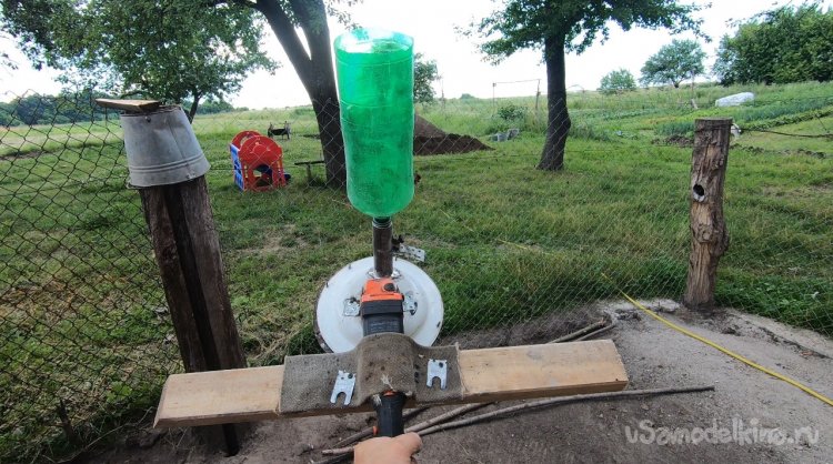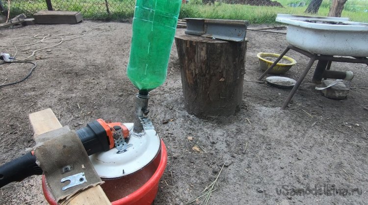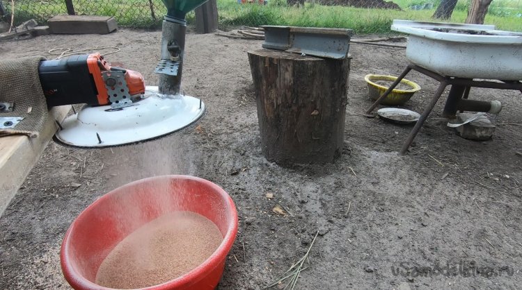 Ну что, отправляемся испытывать, ставим бутылку в качестве бункера, включаем болгарку и засыпаем зерно. регулируем подачу так, чтобы не перегружать мотор болгарки. На видео она у меня небольшая, пусть лучше медленнее но без риска для инструмента.