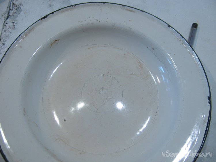 Подбираем неглубокую металлическую тарелку и ищем примерный центр. Также замеряем радиус части болгарки и переносим круг на тарелку. Ну а теперь нужно высверлить отверстие под болгарку. Чтобы не сверлить, можно отбить эмаль и просто выжечь отверстие сваркой.