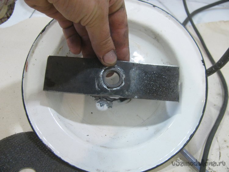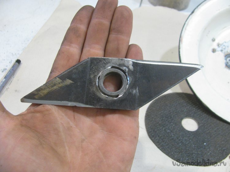 Нож был вырезан из ножовочного полотна, мне нравится эта сталь тем, что она легкая, тонкая и отлично держит заточку. разрыва такого ножа я ни разу не наблюдал. Вырезав полосу длиной около 130 мм, наметил и прожег сваркой отверстие под фланец болгарки. Отверстие можно и высверлить, если у вас имеется инструмент для сверления твердой стали.