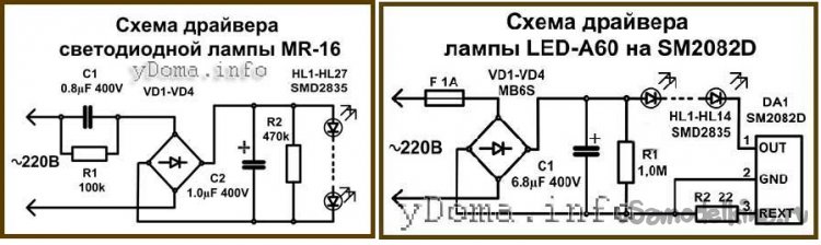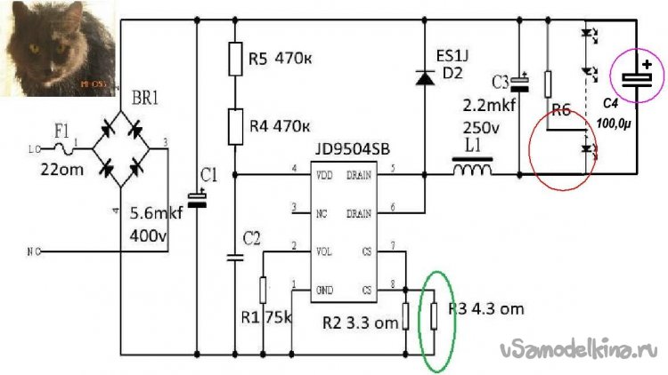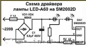 Недавно на сайте был материал: «Устройство задержки выключения – 4», ссылка. Было описано стационарное изделие, требующее вмешательства в домашнюю электропроводку. Я же опишу изготовление, вернее, доработку светодиодной лампочки для получения эффекта замедленного выключения, проведенную мною по просьбе соседки и с ее лампочкой. Описание относится к нормальным лампочкам, предназначенным для установки в жилые помещения и имеющим малый уровень пульсаций светового потока. В таких лампочках параллельно цепочке светодиодов стоит конденсатор, сглаживающий пульсации питающего светодиоды напряжения, и, соответственно, светового потока. Вот одна из схем таких ламп, похожая на нашу.