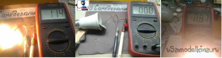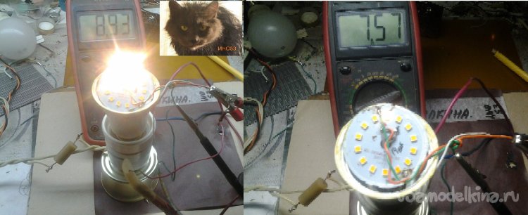 На фото – падение напряжения на всех светодиодах, подключение к одному из светодиодов, падение напряжения на нем при штатном включении. Напряжение 114 В явно занижено, сказывается недостаточная фильтрация.