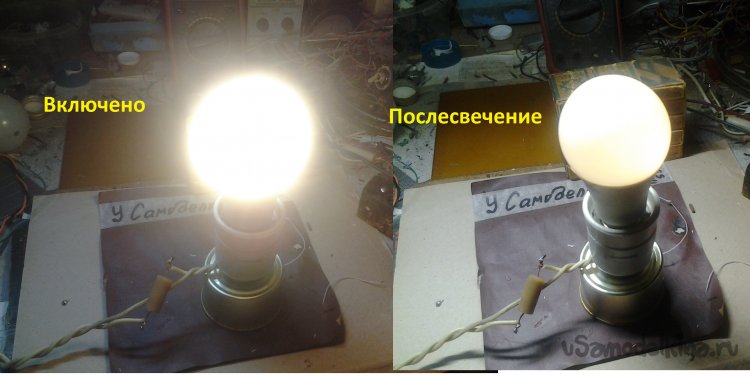 В свое время в одной из своих лампочек я сильно увеличил емкость этого конденсатора, С3, подключив параллельно ему дополнительный довольно большой конденсатор. Теперь, щелкнув выключателем, до наступления темноты я успеваю, не спотыкаясь о кошку, добраться до кровати, содрать штаны и залезть под одеяло, 5…7 сек. Для заказчика это маловато, но места для большого конденсатора в корпусе нет…