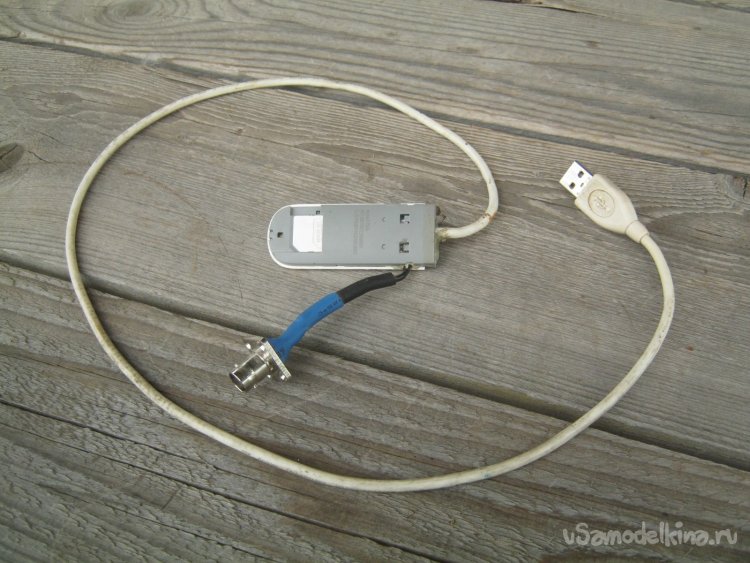 Фото 2. Модем Huawei-Е352b. Классический «USB-свисток». По сравнений с оригиналом, бортовая USB вилка заменена кабелем; в соответствующих местах штатной печатной антенны организованы контактные площадки, к ним припаян и сквозь дыру в корпусе выведен наружу нетолстый коаксиальный кабель с блочной BNC розеткой. Весь дополнительный монтаж перед сборкой корпуса залит термоклеем.