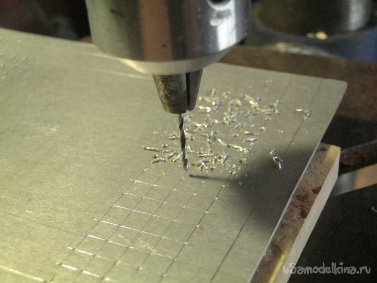 Фото 12. Для крышки коробки использовал нетолстый листовой алюминий – старые кровельные листы доставшиеся по случаю. Кусок такого листа разметил простым карандашиком с линейкой и вырезал заготовку ножницами по металлу. Широкой щеткой с жесткой щетиной и мылом с водой отмыл птичьи отметины и прочую грязь, высушил на солнышке. Наждачкой притупил острые края, разметил крепежные отверстия (некрупные шурупы) и ряды для вентиляции – модем при работе ощутимо нагревается. Накернил центры отверстий на стальной плите. Просверлил на станке, некрупной наждачкой зачистил «терку» с обратной стороны – алюминий, металл мягкий. Все частички алюминия традиционно собрал – это удобный и дешевый реактив для получения полезного в лаборатории водорода.