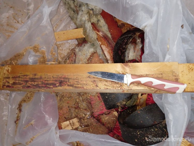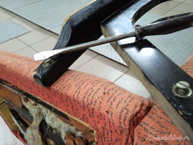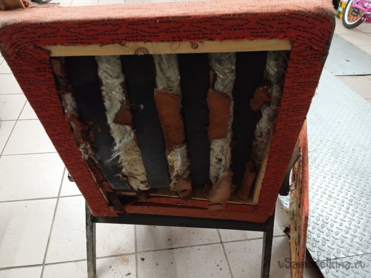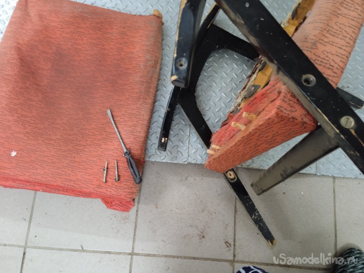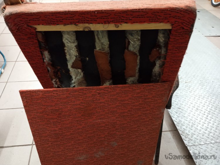 Снял обшивку с сиденья и спинки, а так же резиновые «пружины» и поролон. Оставил голый деревянный каркас. Процесс не из приятных, с годами все истлело, свалялось и «засопливелось». Хорошо, что тараканов и другой «живности» внутри не оказалось.