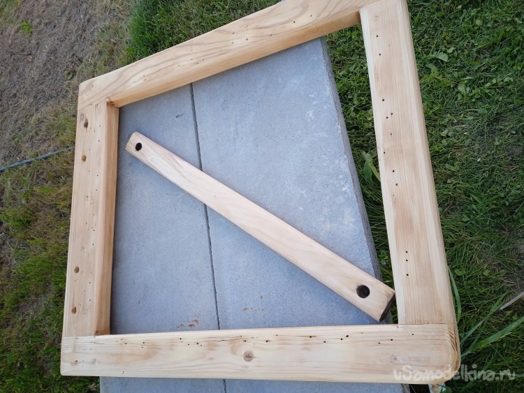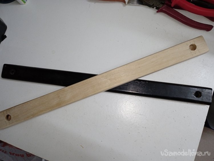 Сделал из березового бруска недостающую нижнюю распорку с технологическими отверстиями с торцов, под крепежные мебельные винты. Процесс изготовления расписывать не стал, работы все стандартные.