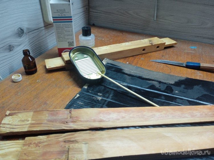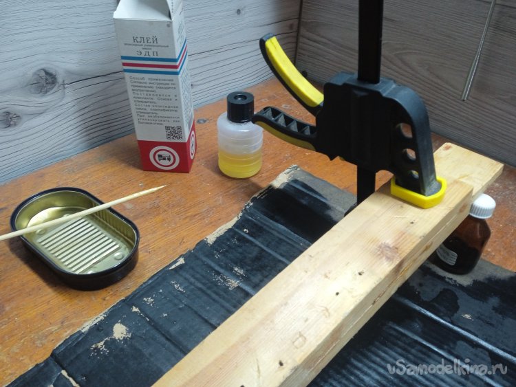 По пропорциям, сделал замес, банка из-под «Шпрот», оказалась подходящей тарой, и начал склейку расколотых деталей каркаса. Стянул струбцинами склеенные детали, до полного отвердевания смолы, а она «торжественно» это сделала, без проблем и в стандартный срок.