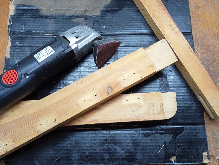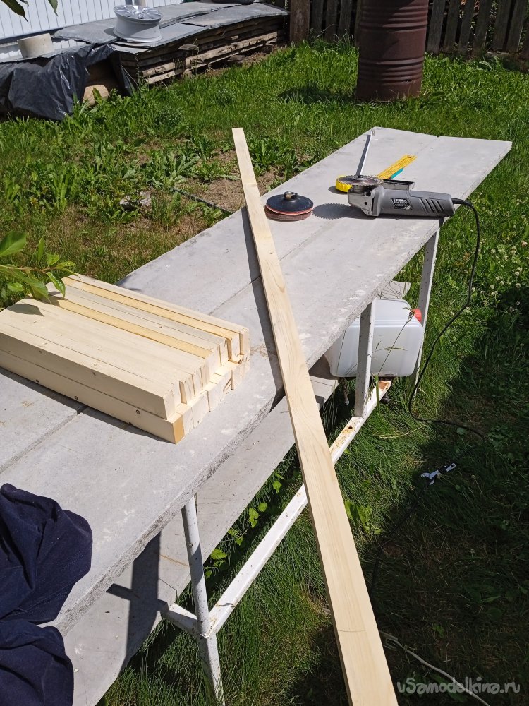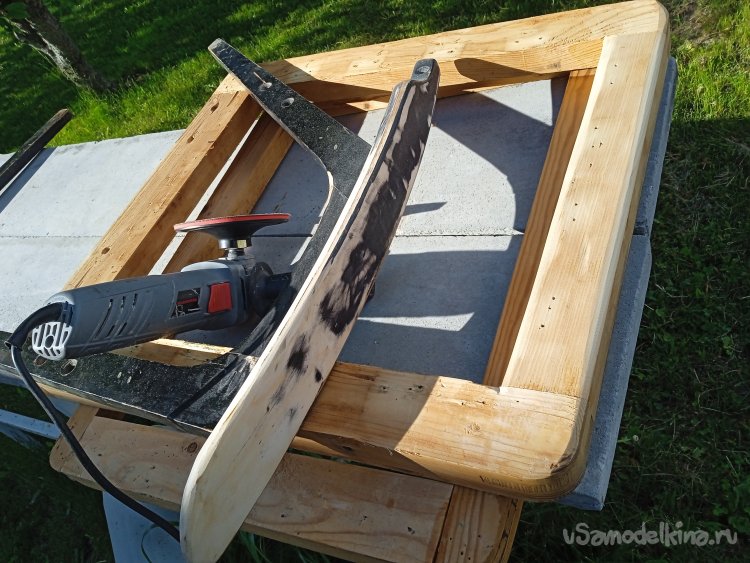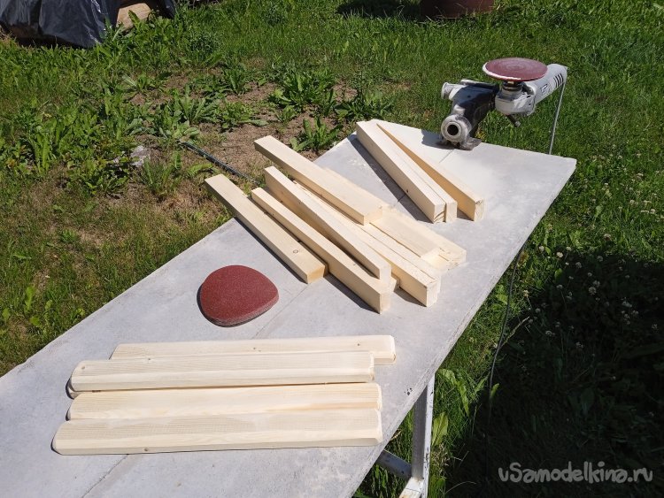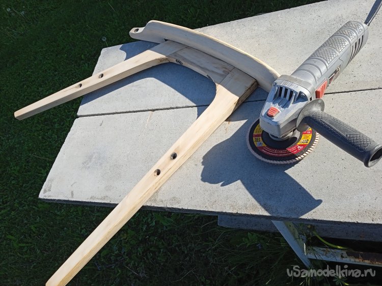Сделав импровизированный шлифовальный станок из тисков и УШМ, придал профиль заготовкам, превратив их в планки, для оснований спинки и сиденья.