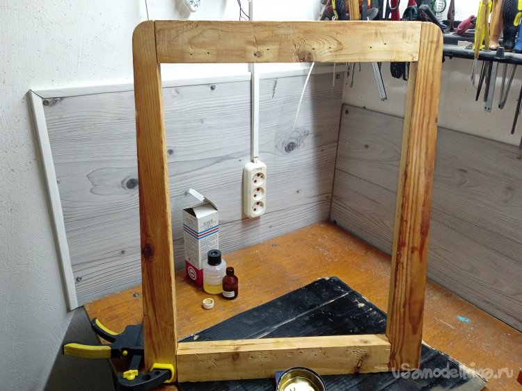Второй замес, и быстренько «в темпе вальса», собирал каркас на смолу. Одно неудобство, не застывшая смола «шустрая» и вытекает из всех щелей. Струбцину использовал, для стяжки «контрольного» угла и удержания конструкции в вертикальном положении. Полости по углам, заливал отдельно, подождав, когда смола начинала твердеть.