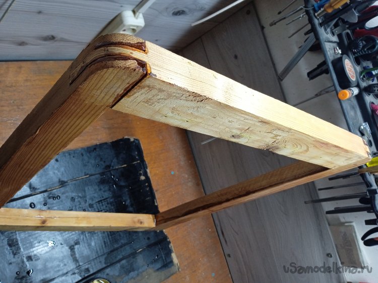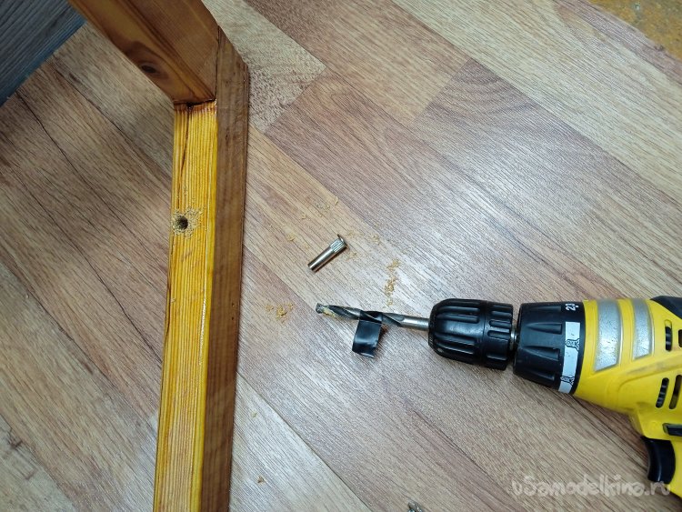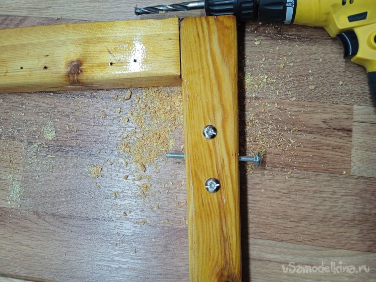 Просверлил насквозь каркасы, в местах крепления к «боковушкам», чтобы потом стянуть их мебельными винтами, для прочности (в оригинале были специальные большие шурупы). Для усиления каркасов от продольных расколов, применил винты – стяжки, в местах нахождения сквозных отверстий.