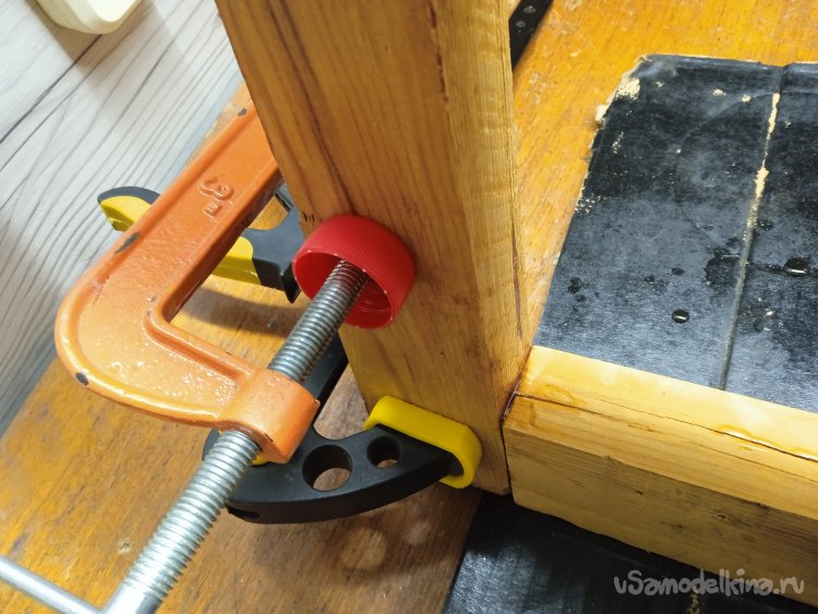 Полезный совет – использовать крышки от ПЭТ бутылок, в качестве прокладки, что бы ни оставалась вмятина на дереве, от прижимной шайбы на винте струбцины.