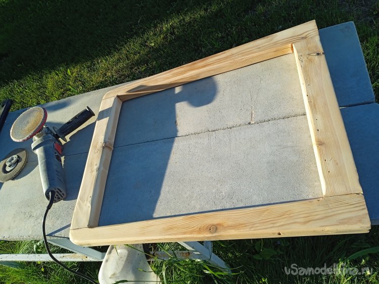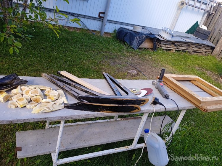 Приготовился еще к одному, неприятному этапу работ – обдирка старого лака и шлифовка деталей кресла. Кстати, на фото видны заготовки еще одной моей самоделки, «Панно из можжевельника», которое я делал параллельно и совместил этапы шлифовки.