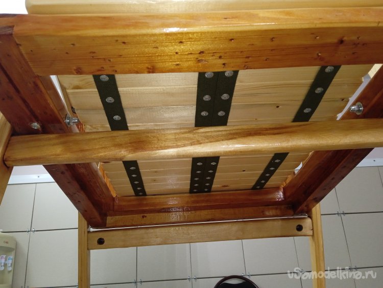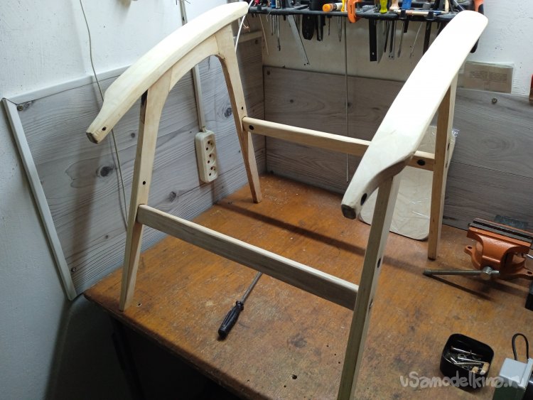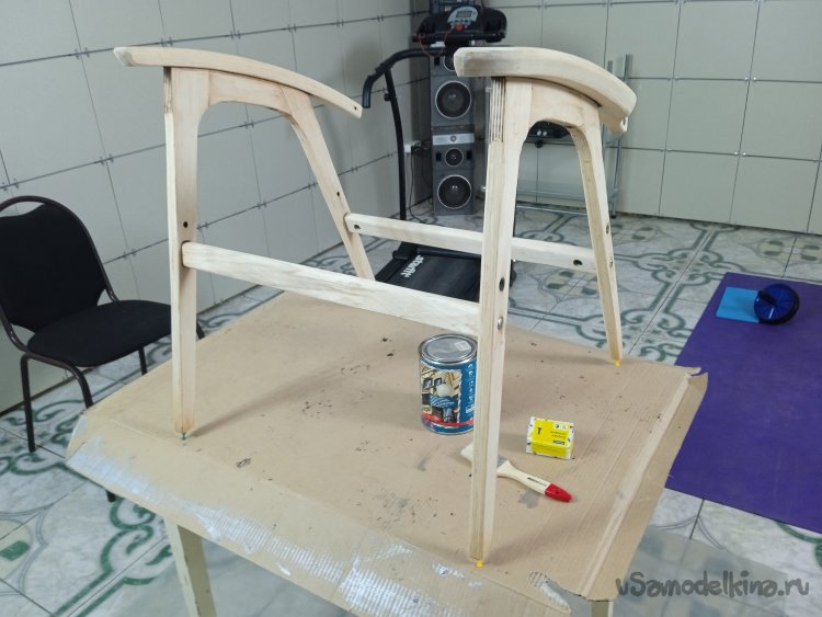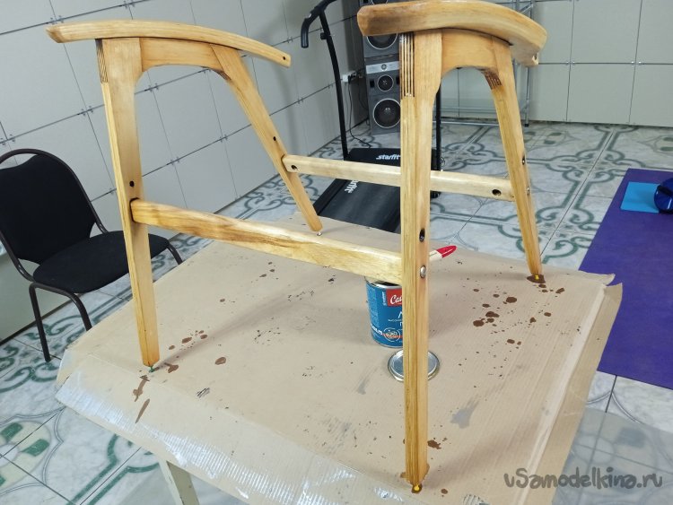 Окончательно собрал все детали воедино. В местах крепления боковушек и поперечины рамы сидения, закрутил конфирматы, заменив оригинальные спец. шурупы. Покрыл еще раз лаком уже собранное кресло.