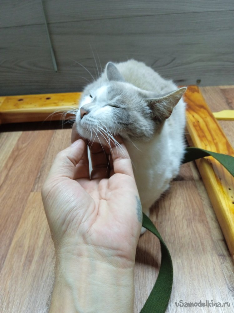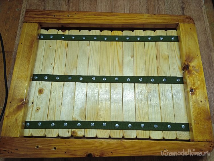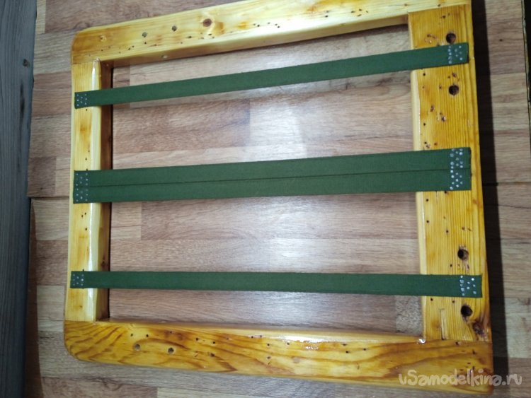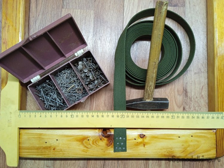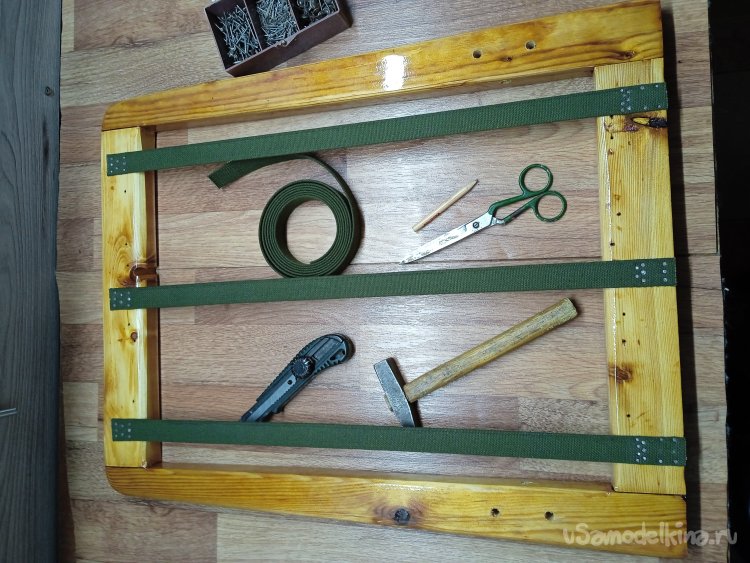 Для начала, натянул на каркасы, как можно туже, ременную ленту. Края ленты, пробил обычными маленькими гвоздиками. «Кошачий контроль», а как без него… На сидение, решил пустить ленты в четыре отрезка, для усиления.