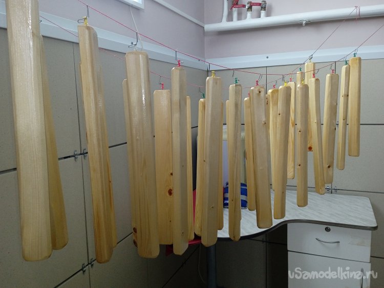 По «старой схеме», все планки под лак. Использовал силовые кнопки и канцелярские скрепки в качестве «вешалок». Лак старался «растягивать» снизу – вверх, держа планку за «вешалку» и упирая ее в стол. Развесил планки для просушки.