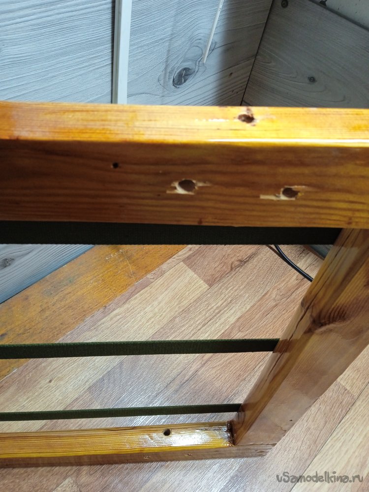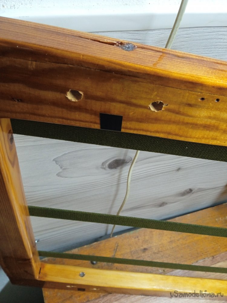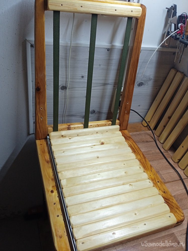 «Мягкие» части, решил делать, по такому же принципу, как и у сидушки шезлонга (лента ременная + заготовки из вагонки), делал я ее лет 10 назад и вся конструкция, еще достойно держится. Только на кресло буду использовать ленту ременную + бруски 20Х40 мм.