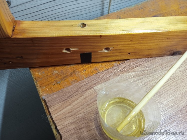 Все не давали мне покоя отверстия в раме спинки, через которые она крепится к подлокотникам, уж очень близко к краю они просверлены. Всего скорее, из за этого рама и раскололась изначально, вся нагрузка спинки, идет на данное соединение. Решил залить отверстия «эпоксидкой», а при сборке пересверлить отверстия рядом, подальше от края.