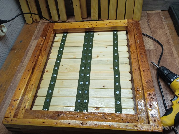 Собрал «урожай» с веревок. На время соединил сиденье со спинкой, разложил планки и крайние (стартовые), закрепил, саморезами насквозь, к рамам. На нижней части рамы спинки, саморезы будут усилением от продольного раскола бруска, в месте шкантового соединения. Все планки закрепил на ленту, при помощи саморезов с прессшайбой.