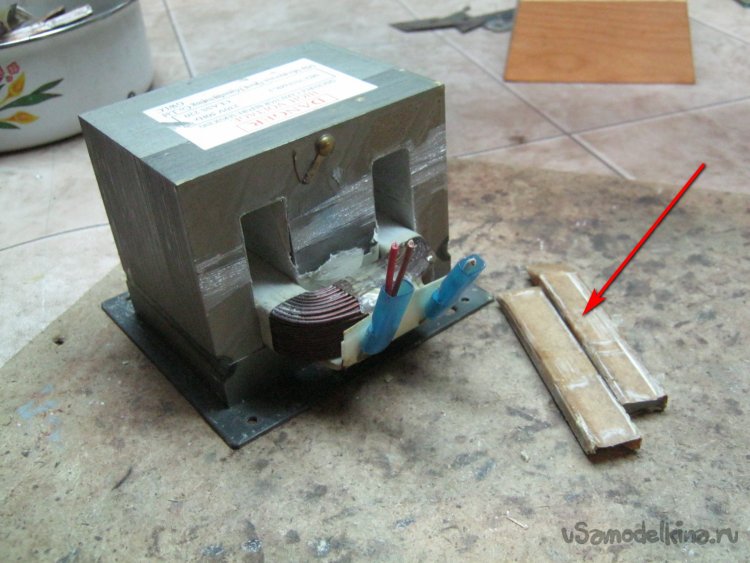 Фото 4. Трансформатор от микроволновой печи, подготовленный к перемотке. Отмечены – магнитные шунты.