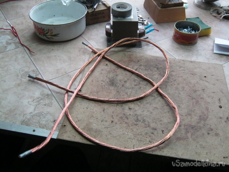 Фото 5. Два куска сварочного провода по 10 мм2 (?) каждый. Освобождены от табельной резиновой изоляции для экономии места в «окне», сложены вместе и изолированы резиновой лентой на тряпочной основе.