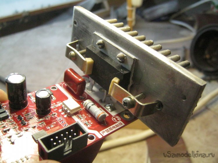 Фото 15. Симистор модуля управления снабдил небольшим игольчатым радиатором. Просверлил радиатор, нарезал резьбу. Прикрутил прибор за фланец, корпус дополнительно прижал парой нашедшихся кронштейнов. Под металлическую спину симистора плюхнул немного КТП-8.