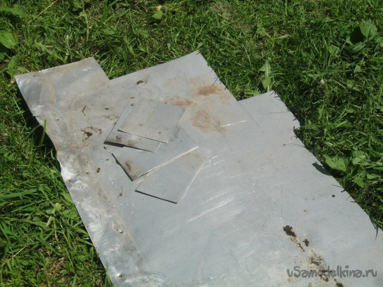 Фото 17. Вентиляционные сетки на боковых сторонах коробки и решетки-панели для установки вентиляторов сделал из нетолстого листового алюминия – остатков старой кровли. Лист отрихтовал, разметил, вырезал заготовки ножницами по металлу. Жесткой щеткой с мылом и водой отмыл и высушил заготовки.