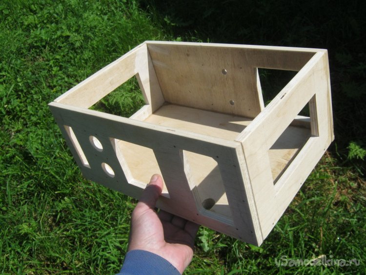 Корпус прибора. Скомпоновал элементы аппарата и вычертил в КАДе. Из 10 мм фанеры нарезал заготовки стенок. Дно сделал из двух склеенных слоев такой фанеры. Собирал на столярный ПВА и некрупные гвоздики.