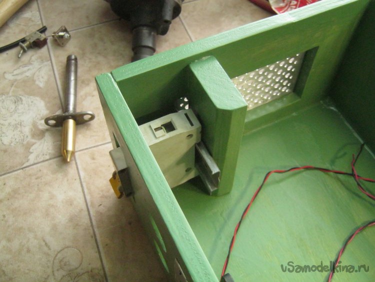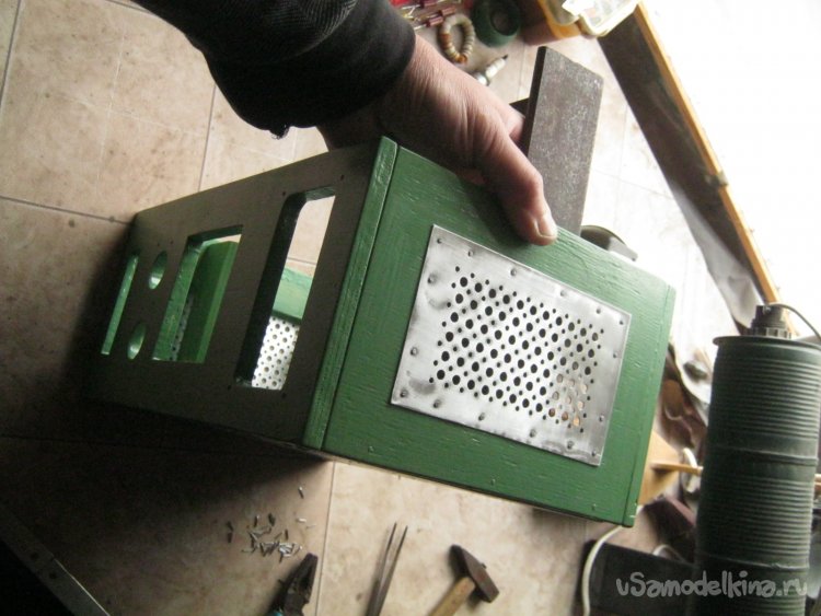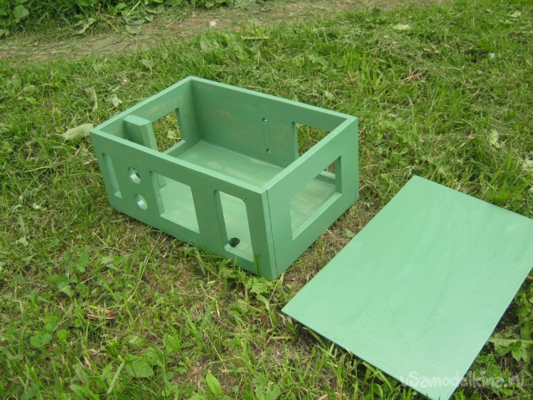Фото 26. Вместе с вырезанной из ДВП крышкой корпус погрунтовал чуть сильнее разбавленной ПФ-115, а после высыхания покрасил в два слоя. После грунтовки некрупной затертой наждачкой пригладил встопорщившиеся волокна.