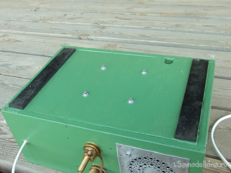 Фото 30. Вид на дно ящика. Сварочный трансформатор закреплен винтами М4 с усиленными шайбами. Полоски резины приклеил Моментом – хорошие нескользящие ножки, опять же – «потай» для головок винтов.