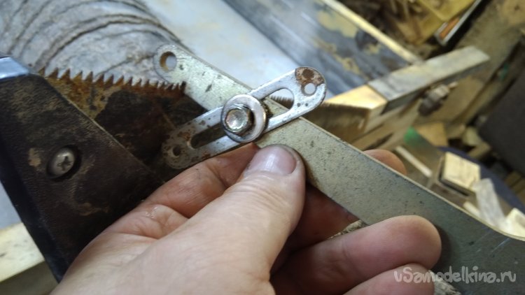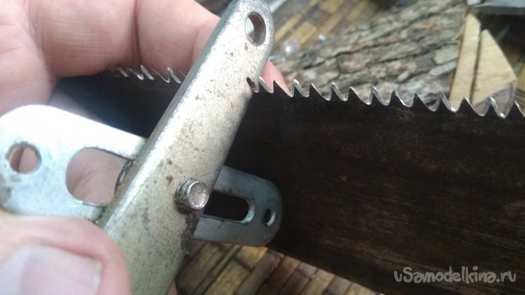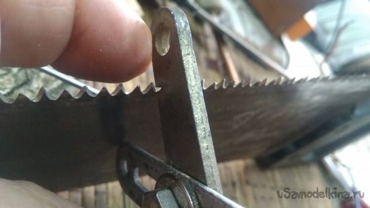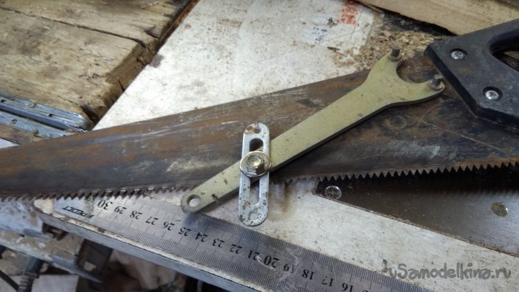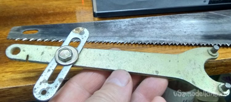 Болгаркой прорезаем в ключе паз равный высоте зуба ножовки. Отступив миллиметров 30-40 сверлим отверстие и нарезаем в нём резьбу. Не особо критично, М3, М4, М5, М6. Там усилие небольшое, но М6 болт с головкой на 10 удобен и обычно легко доступен. Для регулировки угла наклона зубьев, надеваем прорезью на один зуб ножовки и регулировочною планку подводим к полотну ножовки оставляя зазор в пару миллиметров. Правильная разводка, это когда процентов на 20 ширина по зубьям тоще чем само полотно. Например, толщина полотна 1 миллиметр, значит толщина по зубьям 1.2 миллиметра. Конечно, зависит от того что вы будете пилить, и как, по волокнам, попрёк или по диагонали, мелкослойную древесину или с широкими годовыми кольцами, а может и вовсе пластик. Но принцип примерно один, чтобы не зажимало полотно, нужен развод.