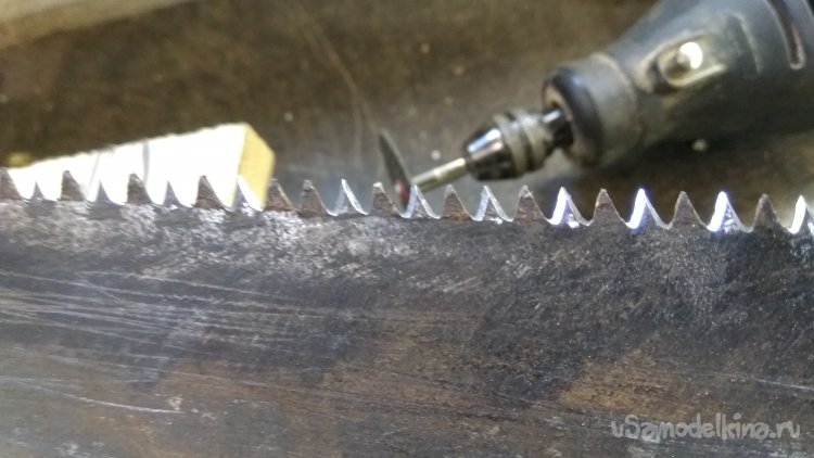 После того как развели, надо наточить. Обычно это делается трёхгранным напильником. Но сейчас зубья зачастую калёные, и напильник может просто скользить по ним. Я точил маленьким диском установленным в дремель. Легко и просто, но требует внимания чтобы не завалить зубья, соблюсти примерный угол заточки и не перепутать последовательность. Маркировка мелом или фломастером помогает не ошибиться.