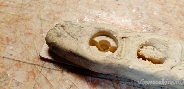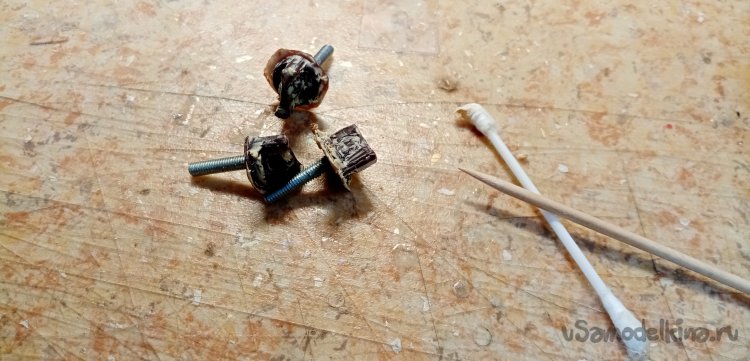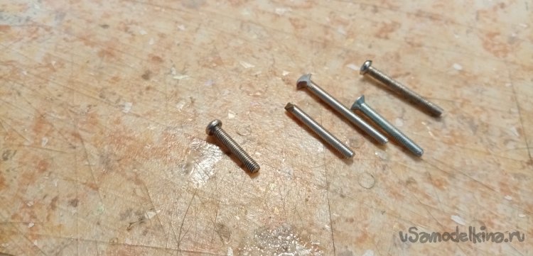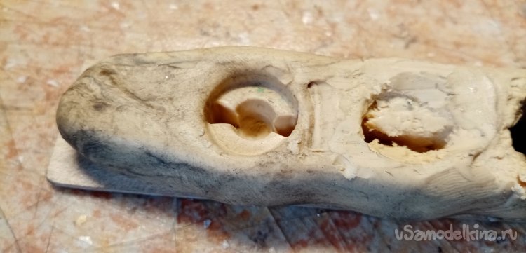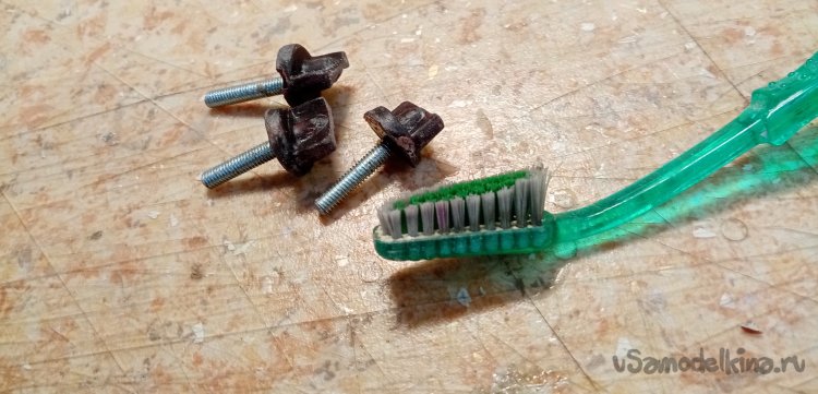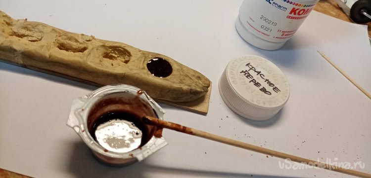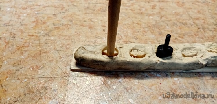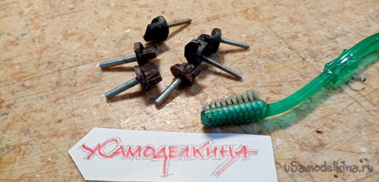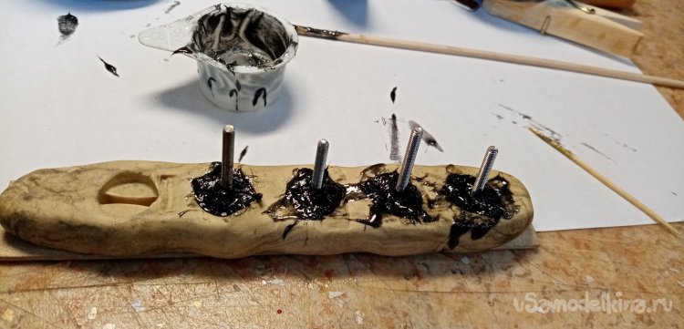 Случай не заставил себя ждать. Осталось немного смолы. Сейчас нужно сделать несколько болтиков большего диаметра. Процесс развивается по проверенной технологии. В пластилине заготовил несколько оттисков. Но поскольку диаметр болтика достаточно большой нужно сделать расширение в головке. Посредине оттиска делаю цилиндрик при помощи ручки кисточки. Поправляю еще раз оттиск.
