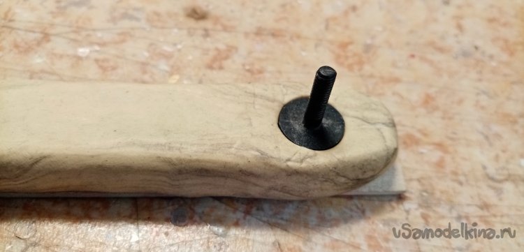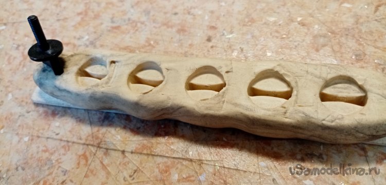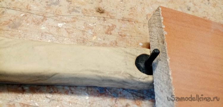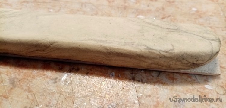 Разминаю скульптурный пластилин в колбаску. Профилирую плоскую вершину при помощи отрезка мебельного щита.
