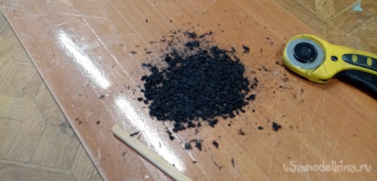 В качестве наполнителя приготовлю мелкую нарезку из остатков карбона, пригодится в хозяйстве. Режу на мебельном щите при помощи роликового ножа. Порезать ножницами мелко этот материал невозможно.
