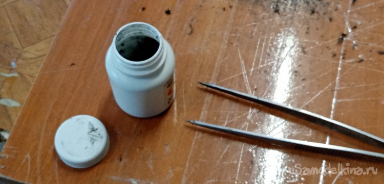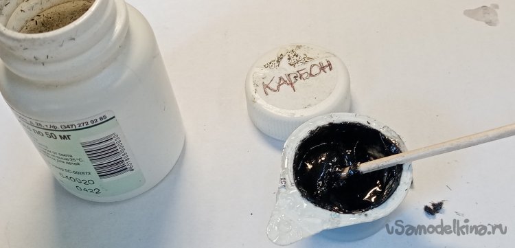 Замешиваю четыре грамма эпоксидной смолы. В качестве плошки использую баночки от сливок под кофе. В такой емкости можно размешать до двенадцати грамм. Тщательно размешиваю состав и после добавляю резаного карбона «по вкусу». Слегка погорячился с наполнителем. Густовато получилось.