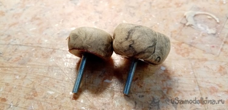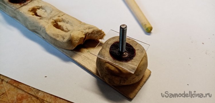 Затем вминаю головку болтика в пластилин. Тщательно приминаю края. Формирую четкий край.